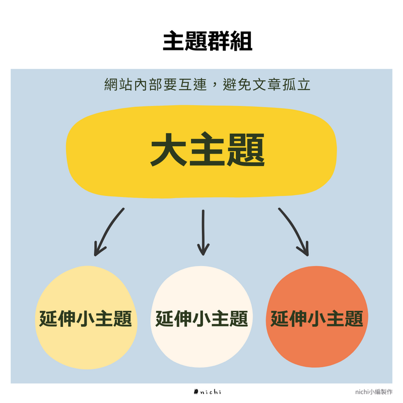 簡單來說,就是用一個大方向帶動一群相關的小主題,並把它們互相串連起來。這樣搜尋引擎能看懂整體內容,讀者也能一目了然。