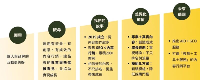 我們的使命,是運用「有流量、有創意、有成效」的內容行銷,讓品牌的專業與熱忱被更多人看見。